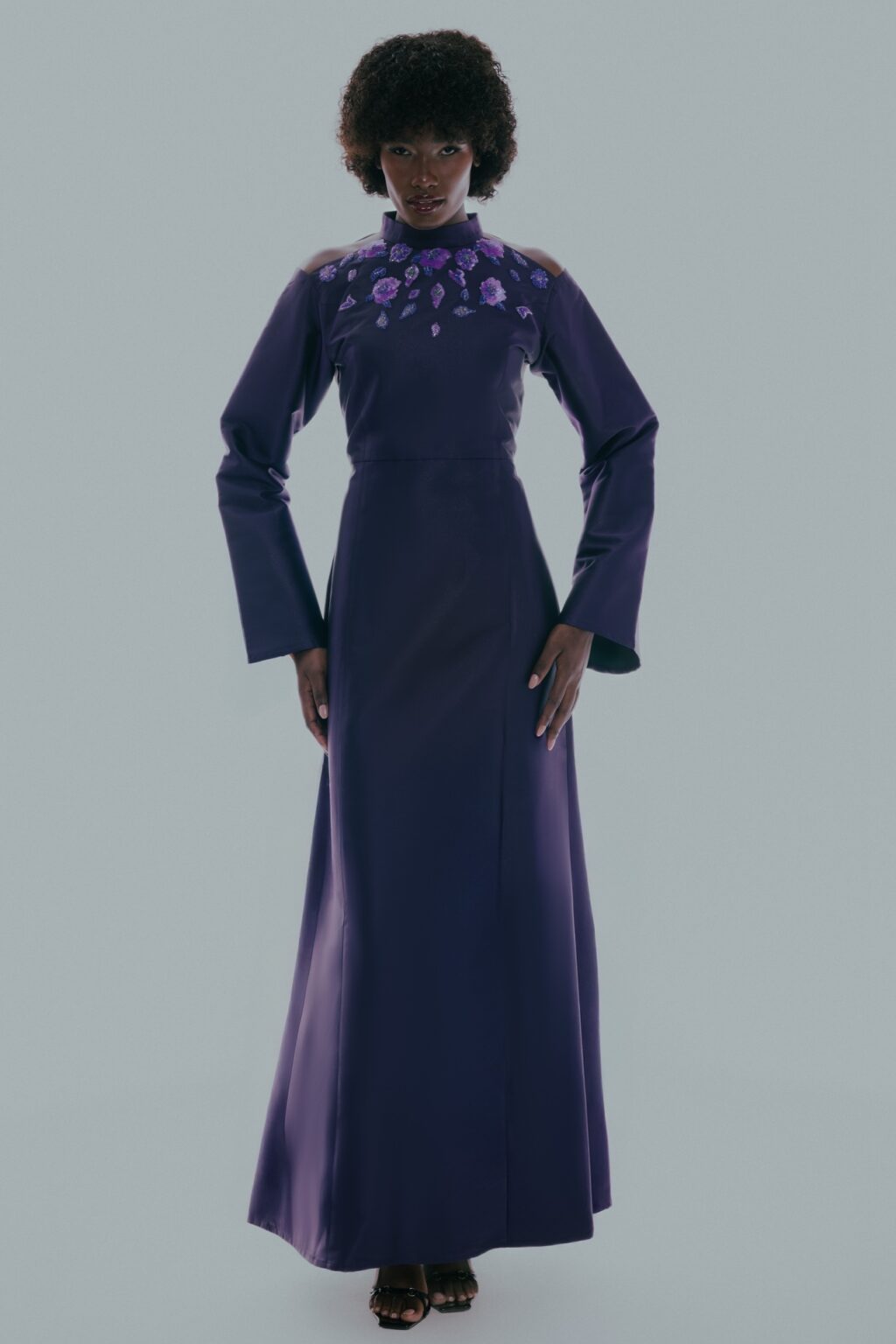 An elegant gown featuring a luxurious design with a captivating shoulder cut and exquisite hand embroidery adorned with scattered stones across the chest. The shimmering fabric adds a refined touch, making it perfect for evening events and special occasions.